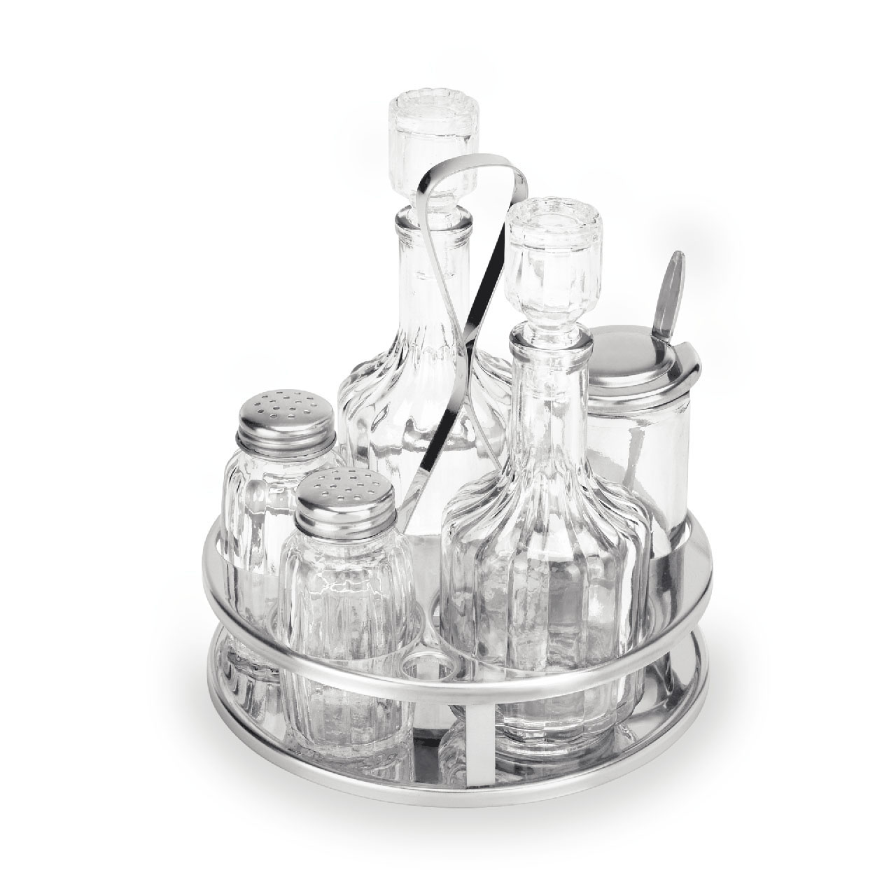 5-teiliges Set Menážka 1480, bestehend aus Essig und Öl, Salz und Pfeffer sowie einem Saucenbehälter (Höhe 17 cm), Edelstahl und Glas. Ideal für den professionellen Einsatz in der Gastronomie. Hochwertige Materialien garantieren Langlebigkeit und Zuverlässigkeit.