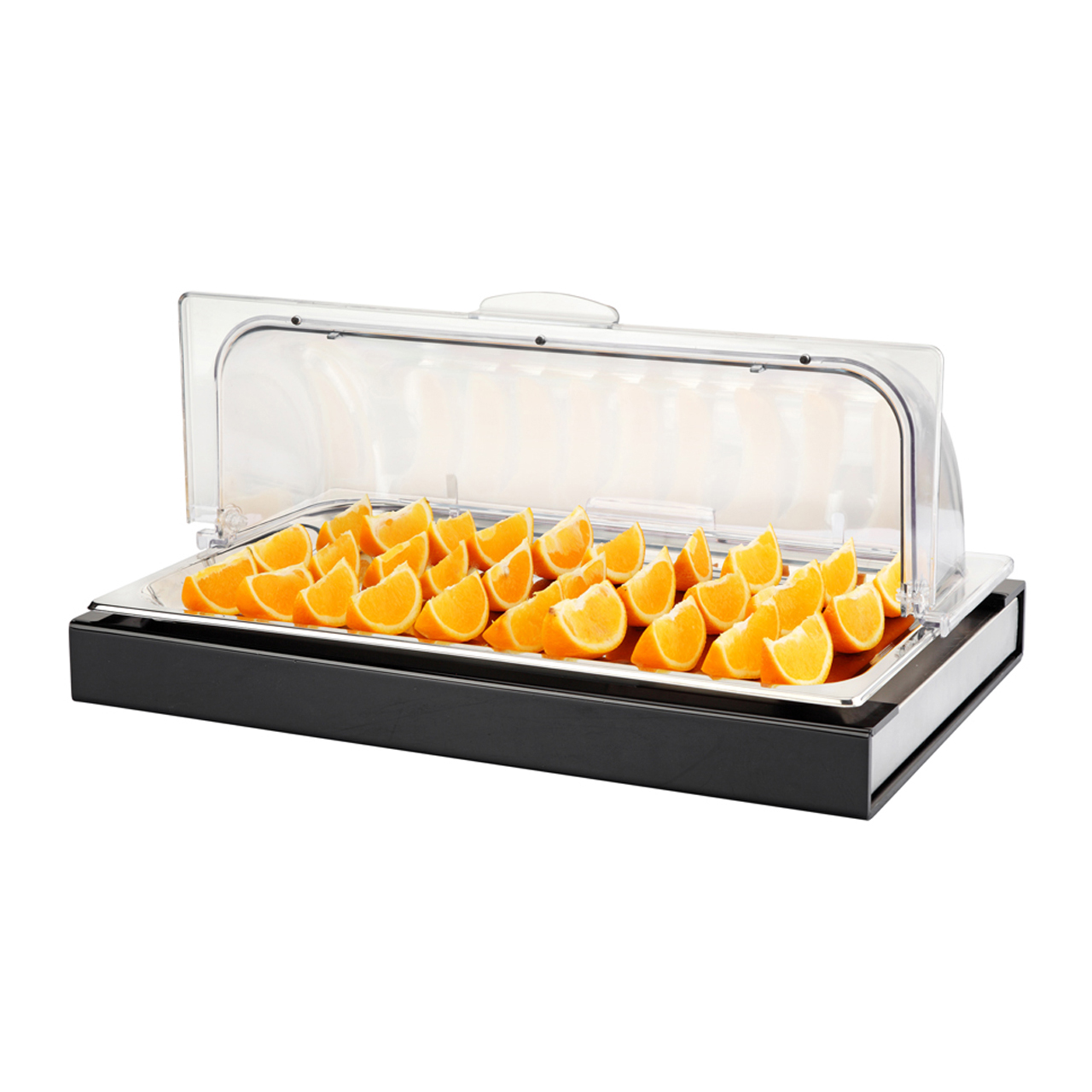 Buffetvitrine GN 1/1 mit Rolldeckel aus Polycarbonat, Rahmen aus Acryl, Behälter aus Edelstahl, Kühleinsatz aus Edelstahl GN 1/1.