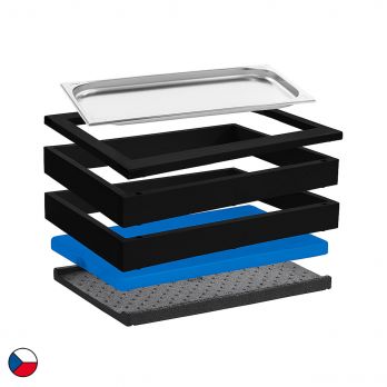 Gekühltes modul ist eine Komplettlösung für kalte modules. Dieses Set besteht aus zwei Basisrahmen (58 x 40,5 x 6,5cm), ergänzt durch einen oberen Holzrahmen für GN1/1 sowie folgendes Zubehör: eine schwarzes Buchenholze wärmeisolierende Unterlage, ein Kühlelement und ein GN-Behälter aus Edelstahl GN1/1–20mm. Das schwarze Holzdekor fügt sich harmonisch in jede Umgebung ein – sei es im Frühstücksbereich eines Hotels, bei einem Firmenmodule oder bei Catering-Veranstaltungen. Dank des einfachen modularen Systems lässt sich das Set flexibel verschieben, kombinieren und an verschiedene Raumgegebenheiten anpassen.