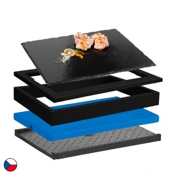Gekühltes modul mit Schieferplatte ist eine Komplettlösung für kalte modules. Dieses Set besteht aus einem Basisrahmen (58 x 40,5 x 6,5cm), ergänzt durch einen oberen Holzrahmen für GN1/1 sowie folgendes Zubehör: eine schwarzes Buchenholze wärmeisolierende Unterlage, ein Kühlelement und ein Schiefertablett im Format GN1/1. Das schwarze Holzdekor fügt sich harmonisch in jede Umgebung ein – sei es im Frühstücksbereich eines Hotels, bei einem Firmenmodule oder bei Catering-Veranstaltungen. Dank des einfachen modularen Systems lässt sich das Set flexibel verschieben, kombinieren und an verschiedene Raumgegebenheiten anpassen.