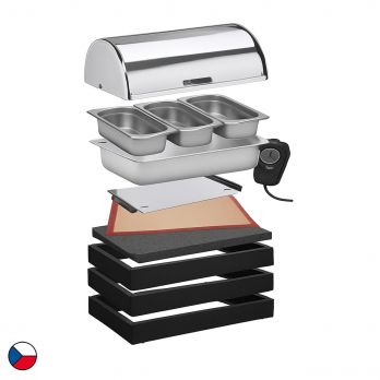 Der beheizte modul ist eine Komplettlösung für warme modules. Dieses Set besteht aus drei Basisrahmen (58 x 40,5 x 6,5cm), ergänzt durch einen oberen Holzrahmen für ein Wasserbad sowie weiteres Zubehör: eine schwarzes Buchenholze wärmeisolierende Unterlage, eine Silikoneinlage, ein 400-Watt-Heizelement, drei GN-Behälter aus Edelstahl (GN 1/3–65 mm) und ein Edelstahl-Rolltop-Deckel. Die schwarze Holzoptik verleiht jedem Umfeld eine moderne Note – ob im Frühstücksbereich eines Hotels, bei einem Firmenmodule oder bei Catering-Events. Dank des einfachen modularen Systems lässt sich die Einheit flexibel verschieben, kombinieren und an unterschiedliche Raumgegebenheiten anpassen.