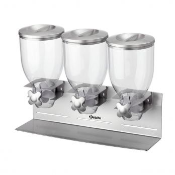 Ideal für Frühstücksbuffets (für Müsli, Cornflakes, Cerealien oder Nüsse). Portionieren ohne Zerbröseln dank einfacher Drehung; geeignet für Schüsseln bis 7,5 cm Höhe. Sockel aus silberfarben lackiertem Stahlblech. Behälter aus robustem, kratzfestem Kunststoff. Fassungsvermögen: 3 x 3,5 Liter. Leicht zu reinigen. Maße: 540 (B) x 170 (T) x 395 (H) mm. Zur Wandmontage geeignet (Befestigungsmaterial nicht im Lieferumfang enthalten). Gewicht: 5,6 kg.