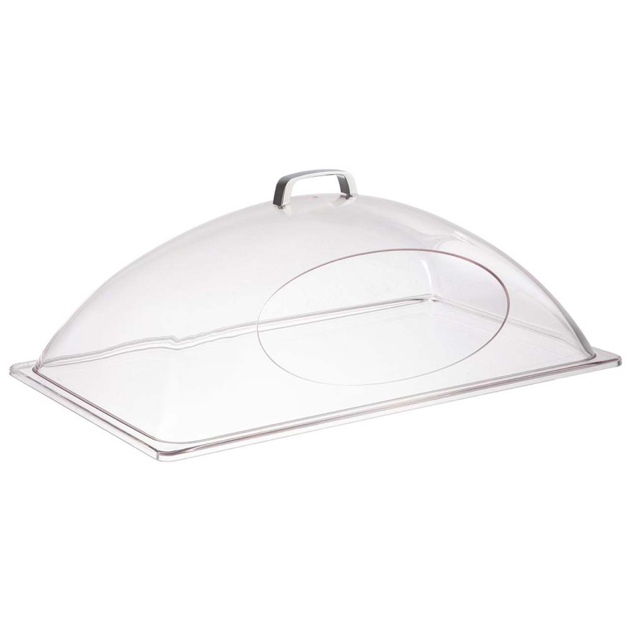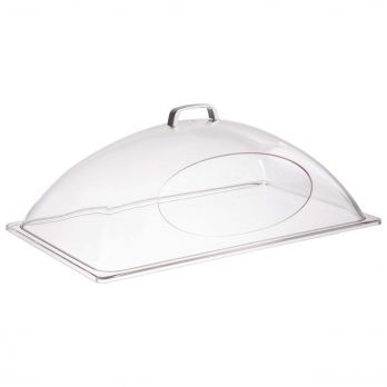 Praktische GN 1/1 Kuppelhaube mit Frontöffnung ermöglicht ein einfaches Servieren ohne Abnehmen. Der transparente SAN-Kunststoff sorgt für optimale Sicht auf den Inhalt und unterstützt die Einhaltung von Hygiene sowie Temperatur der Speisen. Der verchromte Griff aus Zinkdruckguss gewährleistet eine komfortable Handhabung und ein elegantes Erscheinungsbild.