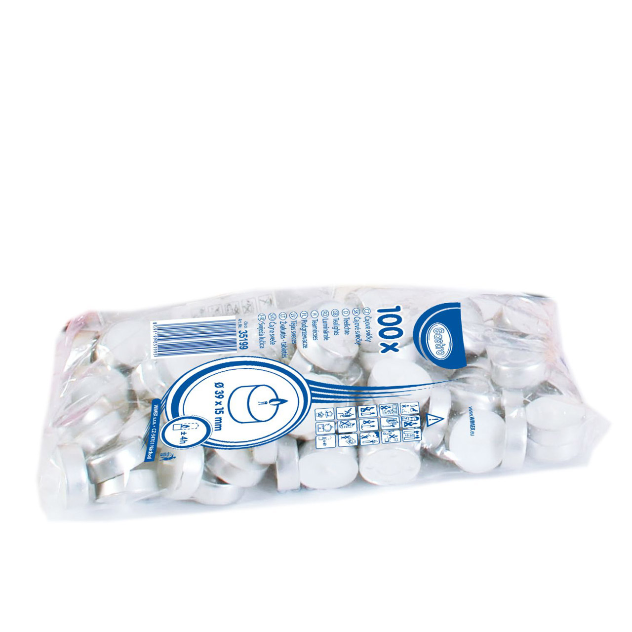 Teekerze mit einem Durchmesser von 3,9 cm und einer Höhe von 1,5 cm. Brenndauer 4 Stunden. In der Packung sind 100 Stück enthalten.