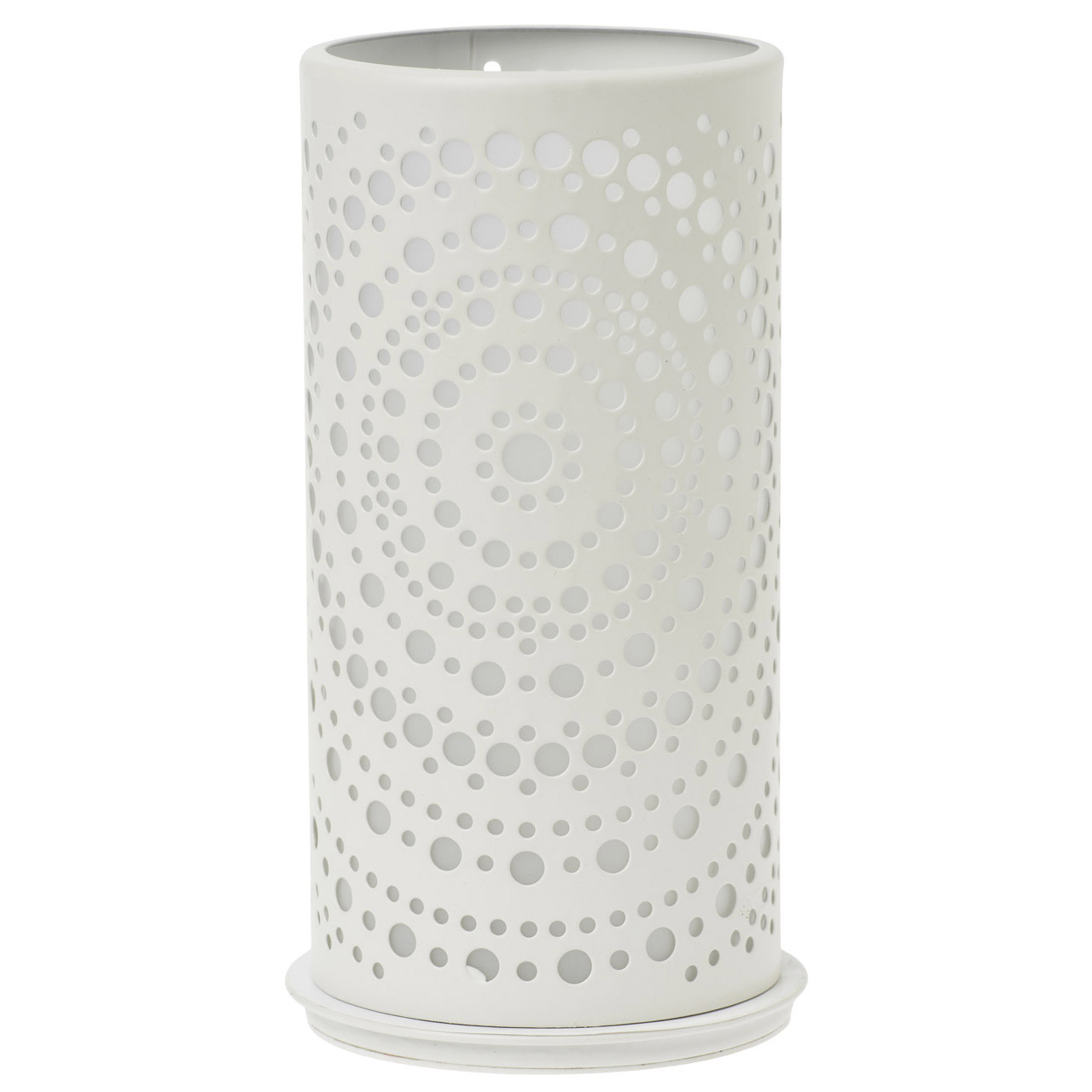 Der Kerzenhalter BILLY WHITE aus Metall, verwendbar für Teelichter und LED-Kerzen, sorgt für ein wunderschönes Muster auf dem Tisch. Größe 14 x 7,5 cm.