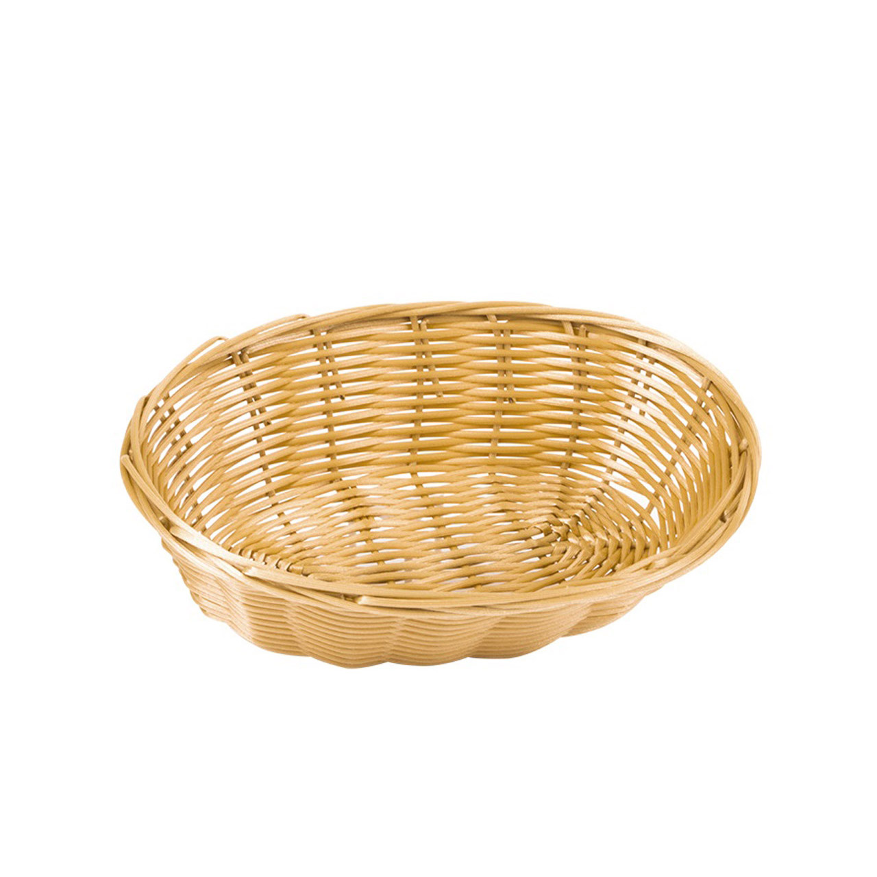 Ovaler Korb aus beigem Polyrattan. Sehr pflegeleicht, spülmaschinenfest. Größe 23 x 15 cm, Höhe 7 cm.