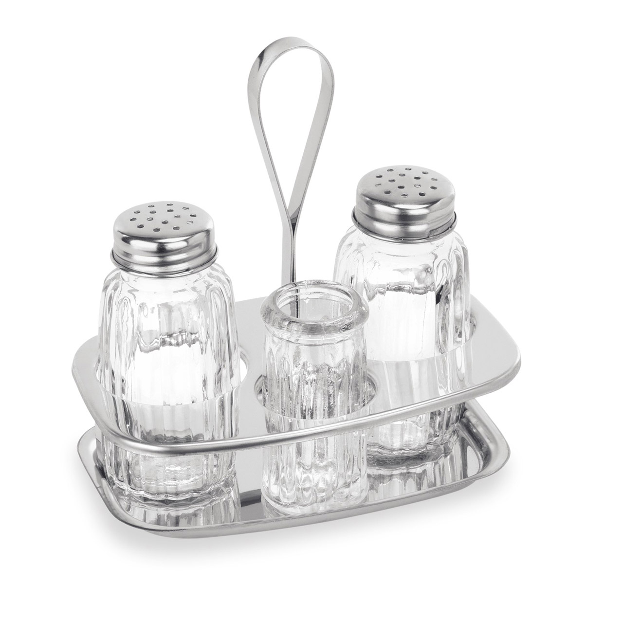 Dreiteiliger Halter für Salz, Pfeffer und Zahnstocher, Höhe 12,5 cm, Edelstahl, Glas. Ideal für den professionellen Einsatz in der Gastronomie. Hochwertige Materialien garantieren Langlebigkeit und Zuverlässigkeit.