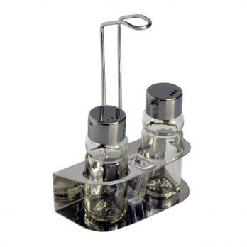Tischgewürzset bestehend aus Salz- und Pfefferstreuer, Zahnstocherspender. Material Glas, rostfreier Stahl.
