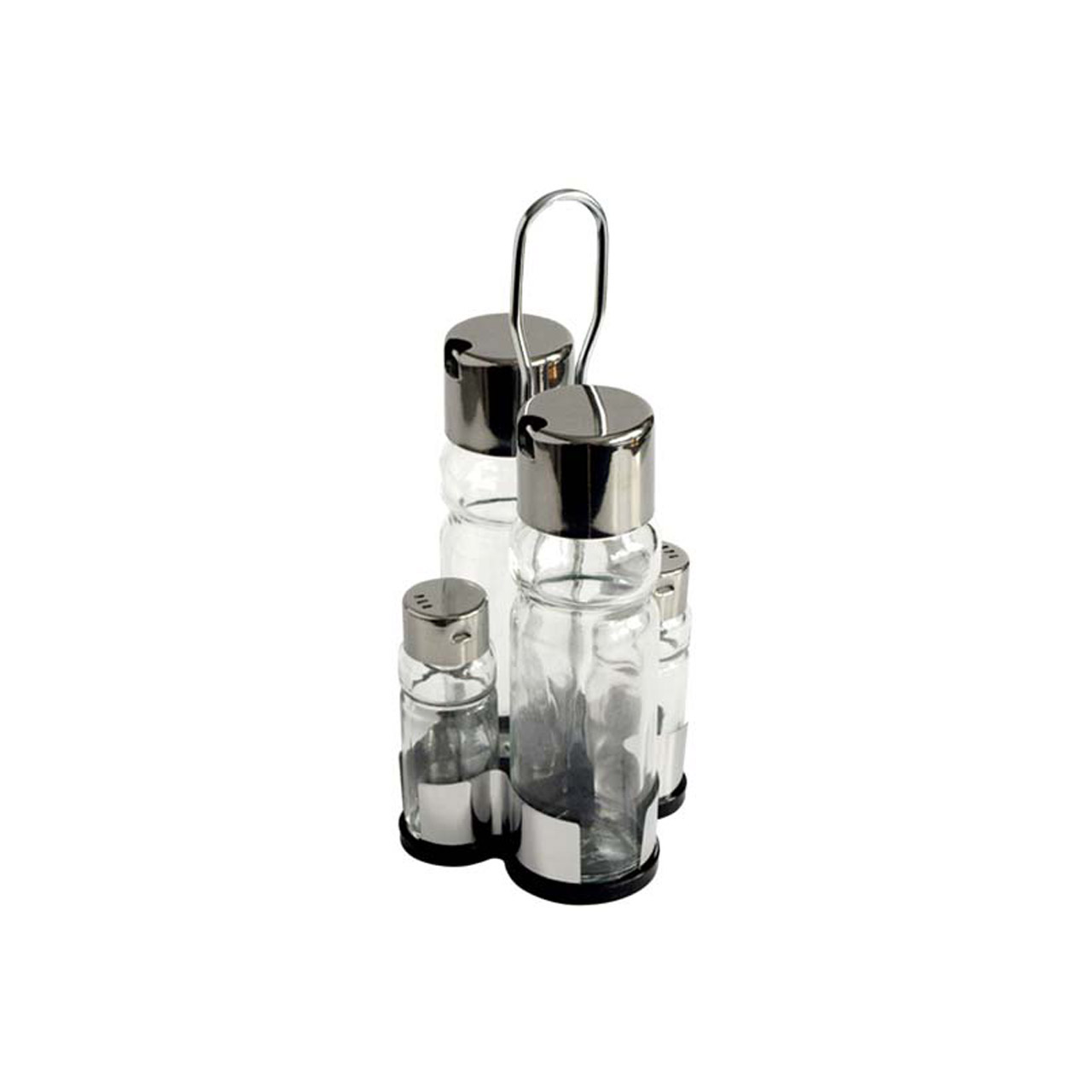 Tischgewürzset bestehend aus Salz- und Pfefferstreuer, 2x Öl-/Essigbehälter. Material Glas, rostfreier Stahl.