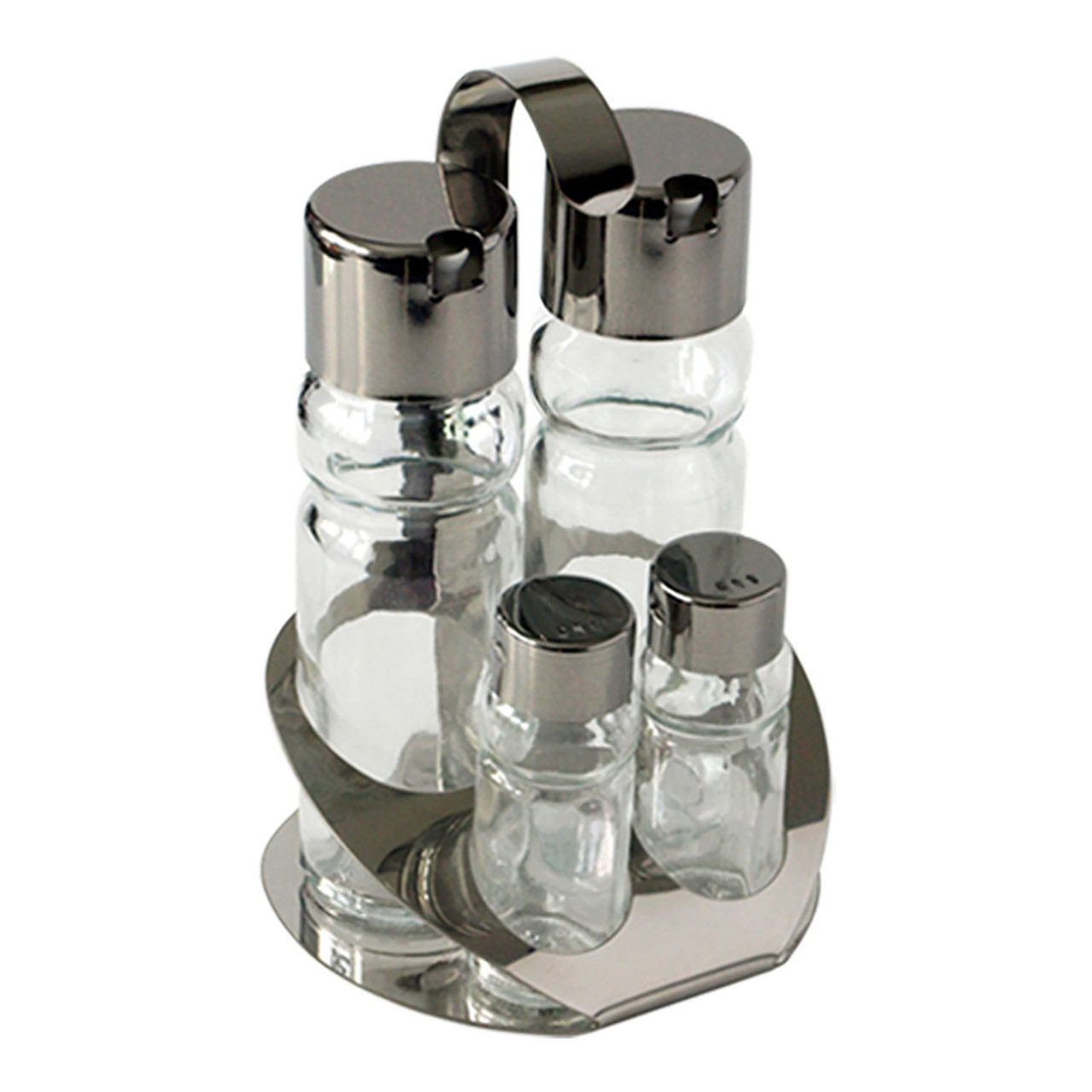 Tischgewürzset bestehend aus Salz- und Pfefferstreuer, 2x Öl-/Essigbehälter. Material Glas, rostfreier Stahl.