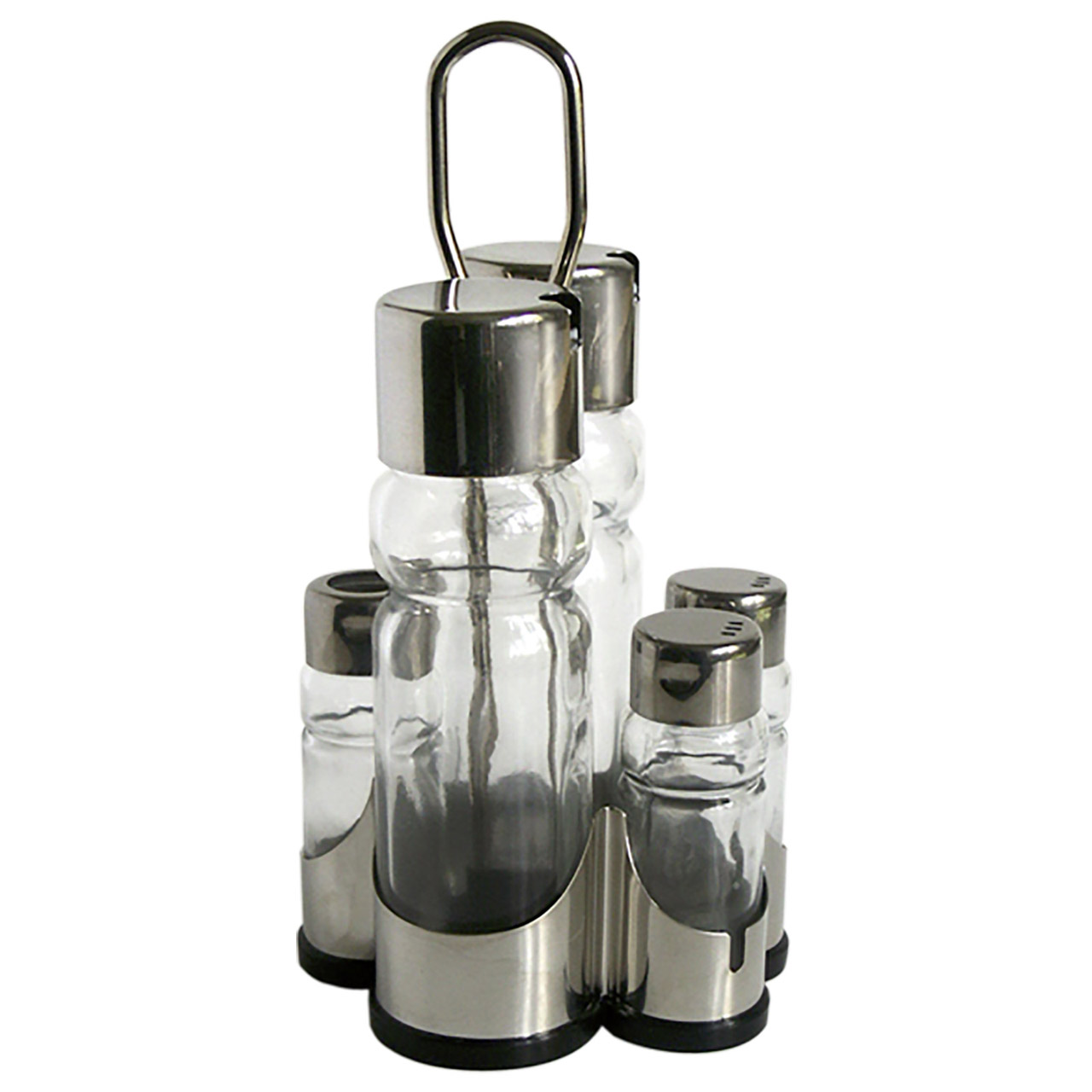 Tischgewürzset bestehend aus Salz- und Pfefferstreuer, Zahnstocher, 2x Öl-/Essigbehälter. Material Glas, rostfreier Stahl.