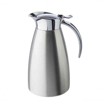 Komplett aus Edelstahl gefertigte, doppelwandige Thermoskanne, geeignet für die Spülmaschine. Höhe 18 cm.