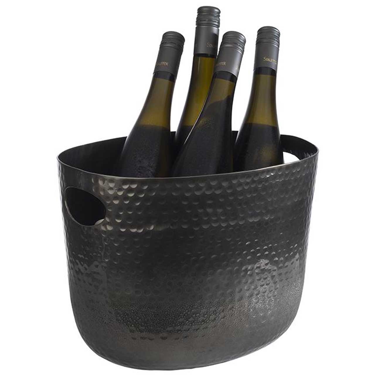Mit diesem eleganten Kühlbehälter bleiben Ihre Weine und Champagner perfekt gekühlt. Er ist aus robustem Metall gefertigt, schwarz lackiert und verfügt über zwei praktische Tragegriffe. Mit einem Fassungsvermögen von 7 Litern und den Maßen 30 x 23,5 cm (Höhe x Breite x Höhe) bietet er ausreichend Platz für Flaschen. Ideal für den privaten und gewerblichen Gebrauch bei Feiern und Partys.