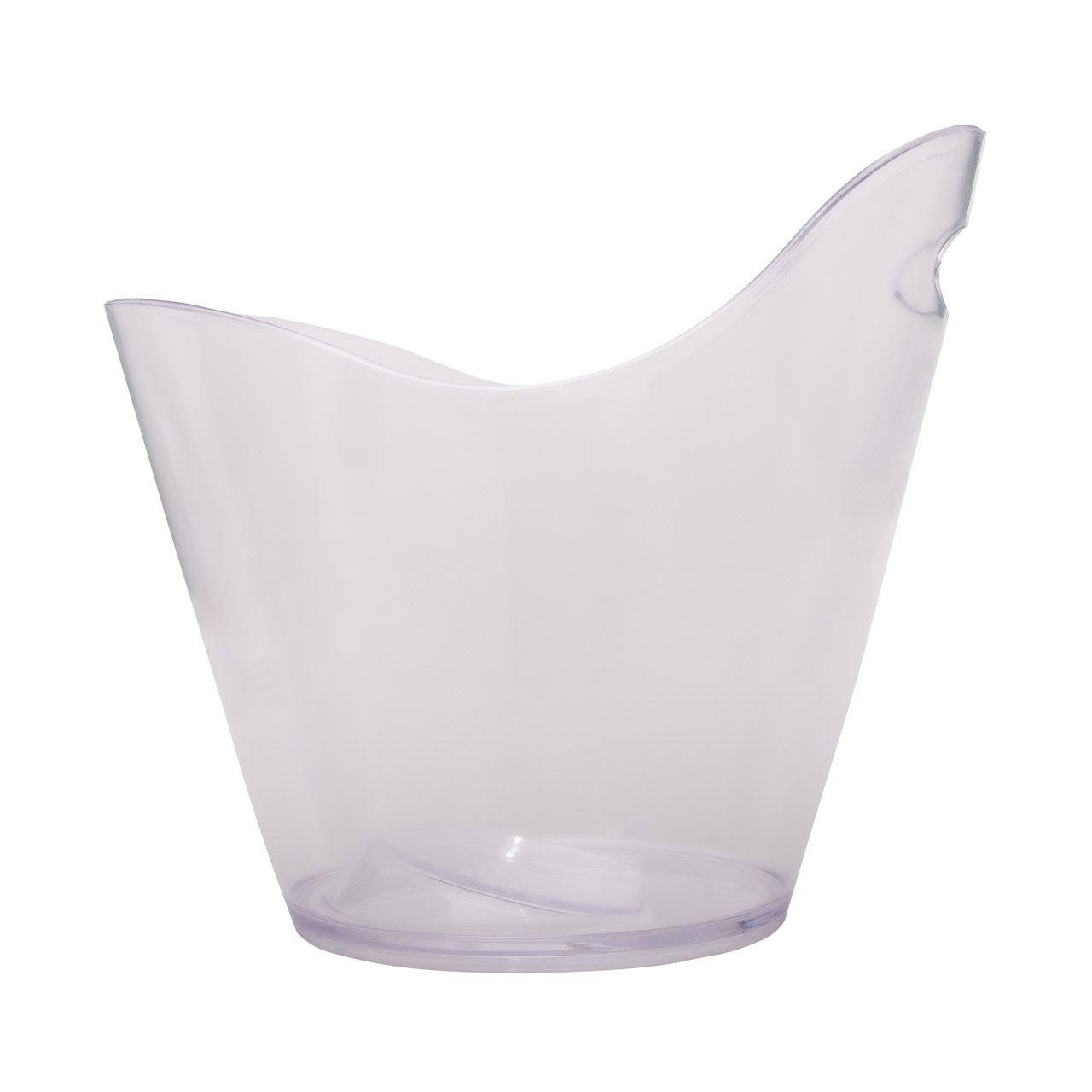 Konischer, durchsichtiger Kunststoffkühler mit Öse für Sekt/Wein. Oberer Durchmesser 28 cm, unterer Durchmesser 24 cm. Die Höhe beträgt 25 cm. PS-Material.