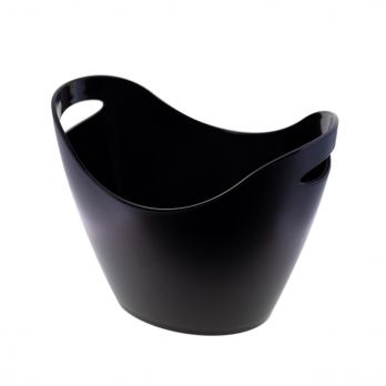 Konischer Kunststoffkühler mit zwei Griffen für Sekt/Wein. Schwarze Matte. Oberer Durchmesser 36 cm, unterer Durchmesser 26 cm. Die Höhe beträgt 25,5 cm. PS-Material.