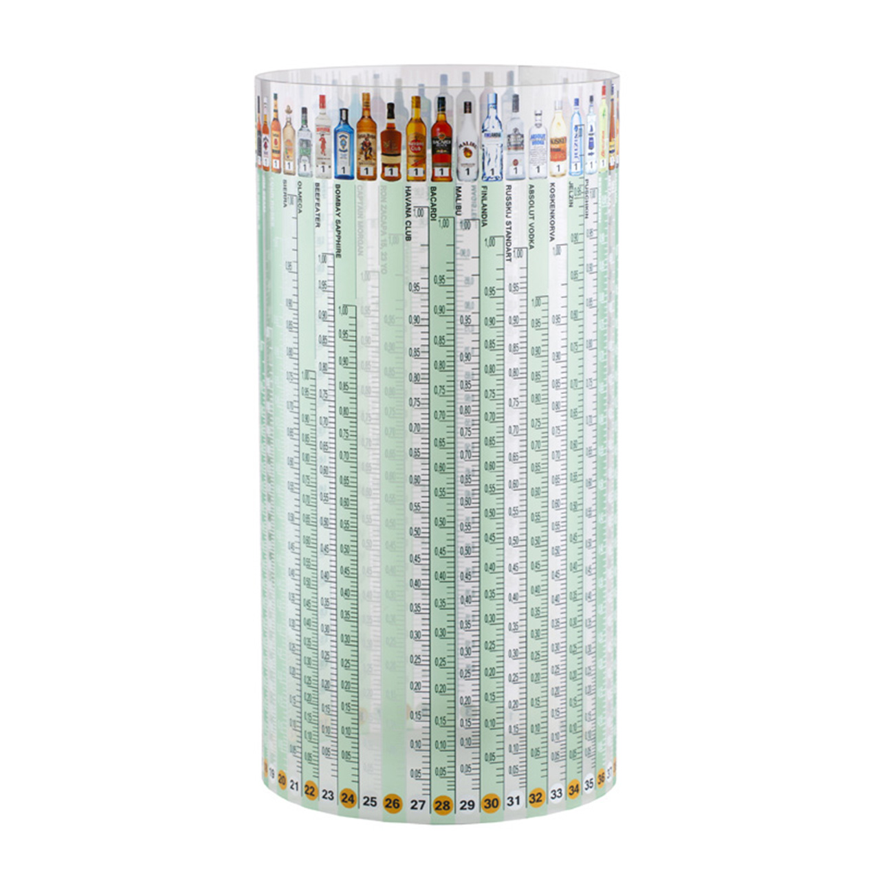 Messzylinder transparent – ein ideales Werkzeug für die Inventur. Informativer Anwendungszylinder zum Abmessen von Alkohol in einer Flasche. Der Messzylinder für Alkohol ist mit einem Aufdruck aus Skalen und Flaschen versehen. Durchsichtiger, wasser- und abriebfester Kunststoffmessstab. Enthält 45 der meistverkauften Alkoholarten.