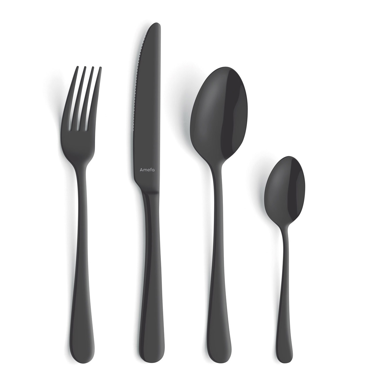 Dessertlöffel aus Edelstahl 18/0 mit schwarzem Finish, der dem Besteck ein modernes, luxuriöses Aussehen verleiht. PVD-Oberflächenbehandlung – das Besteck verfügt über eine dünne Titanbeschichtung, die für lebendige Farben sorgt.