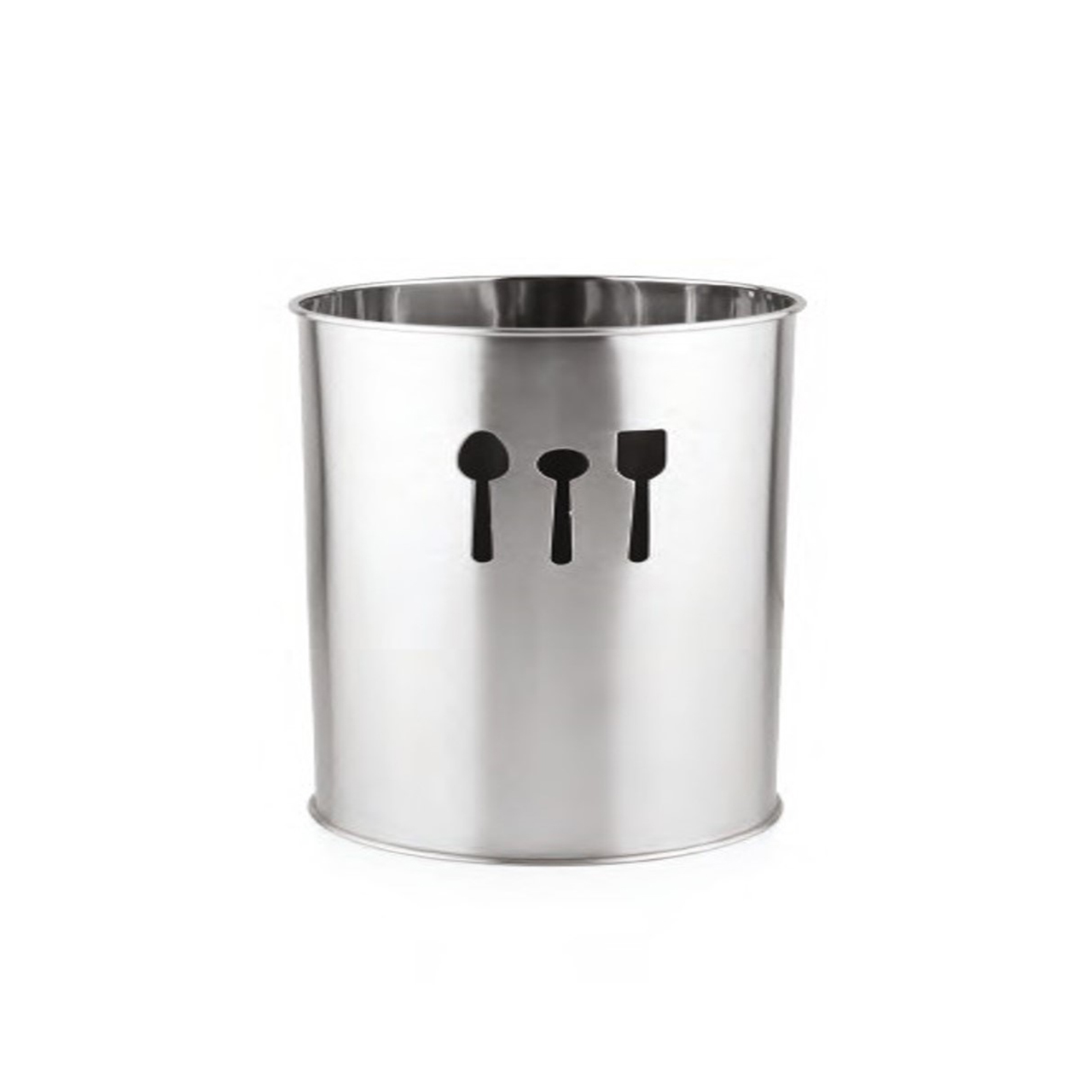 Besteckständer aus Edelstahl mit Dekor. Durchmesser 10 cm und Höhe 11 cm.