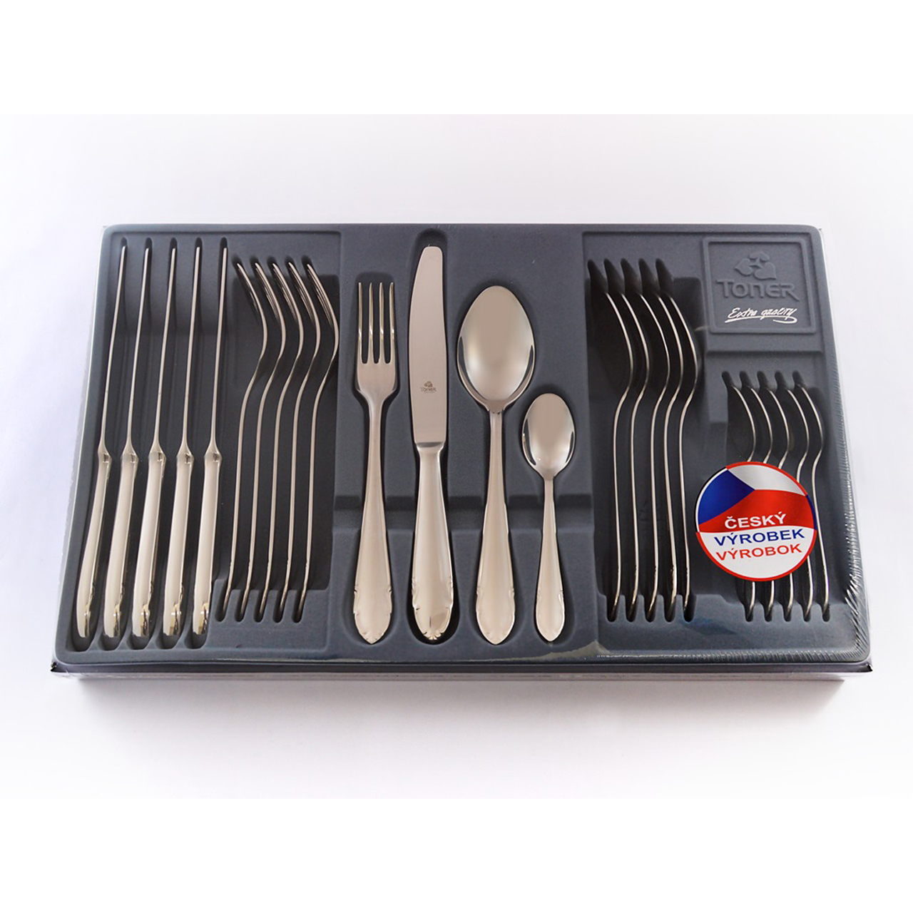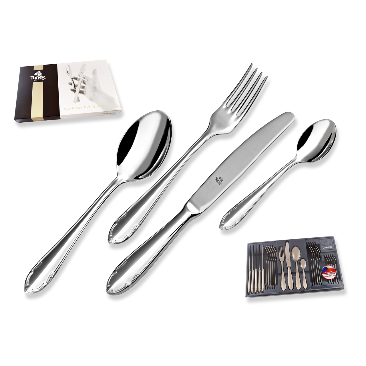 Basisbesteck für 6 Personen in einer Geschenkbox. Spülmaschinenfest, rostfreier Stahl 18/10. TONER Classic ist ein hochwertiges, auf Hochglanz poliertes, ergonomisches Besteck (ausreichend tiefer Suppenlöffel und ausgewogenes Messer) und verfügt zudem über ein komplettes Besteckzubehörsortiment.