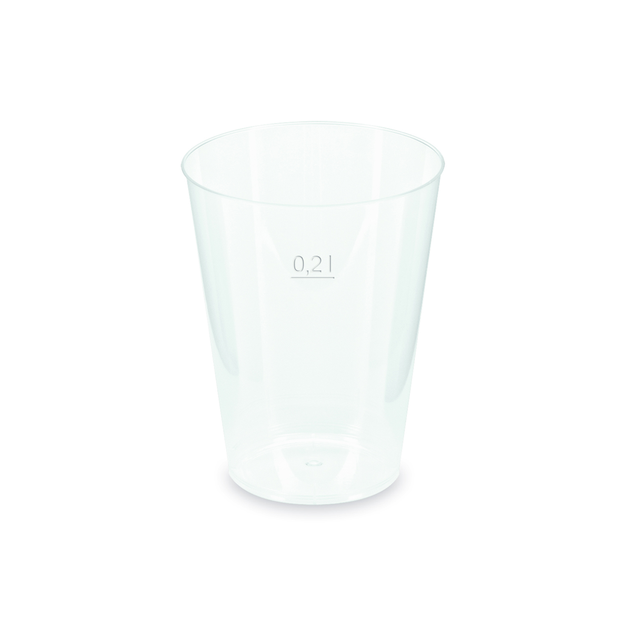 Mehrwegbecher (PP) mit einem Volumen von 0,2 l. Durchmesser: 68 mm, Bodendurchmesser: 53 mm.