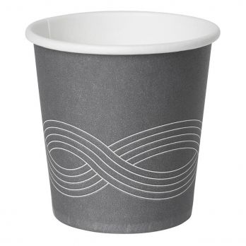 Pappbecher in grauer Farbe mit Dekor, Volumen 0,1 l. Material PAP/PE max +100 °C.