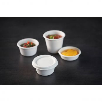 Tasse/Schüssel für Dressing aus Bagasse mit einem Volumen von 85 ml. Durchmesser 6,3 cm, Höhe 5,3 cm. Den Deckel finden Sie unter der Nummer 100030486. Er ist mikrowellengeeignet, bis +100°C.