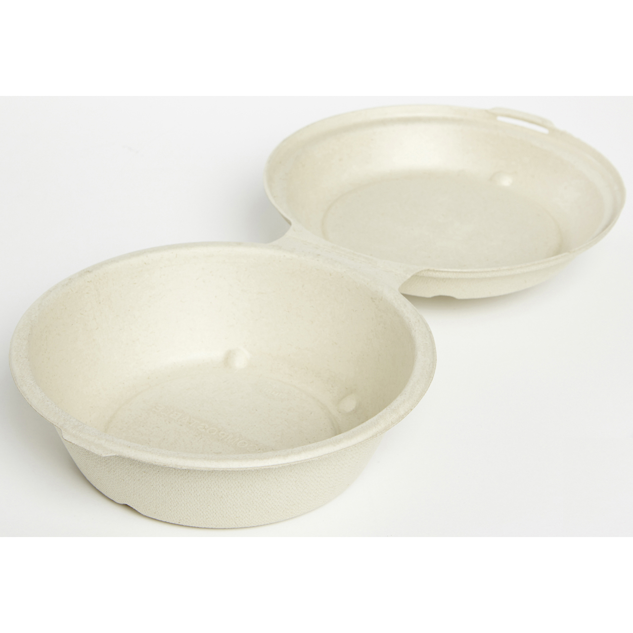 Eine Box aus Bagasse mit einem Deckel von 750 ml. Durchmesser 17,6 cm, Höhe 8 cm. Kann in der Mikrowelle verwendet werden.