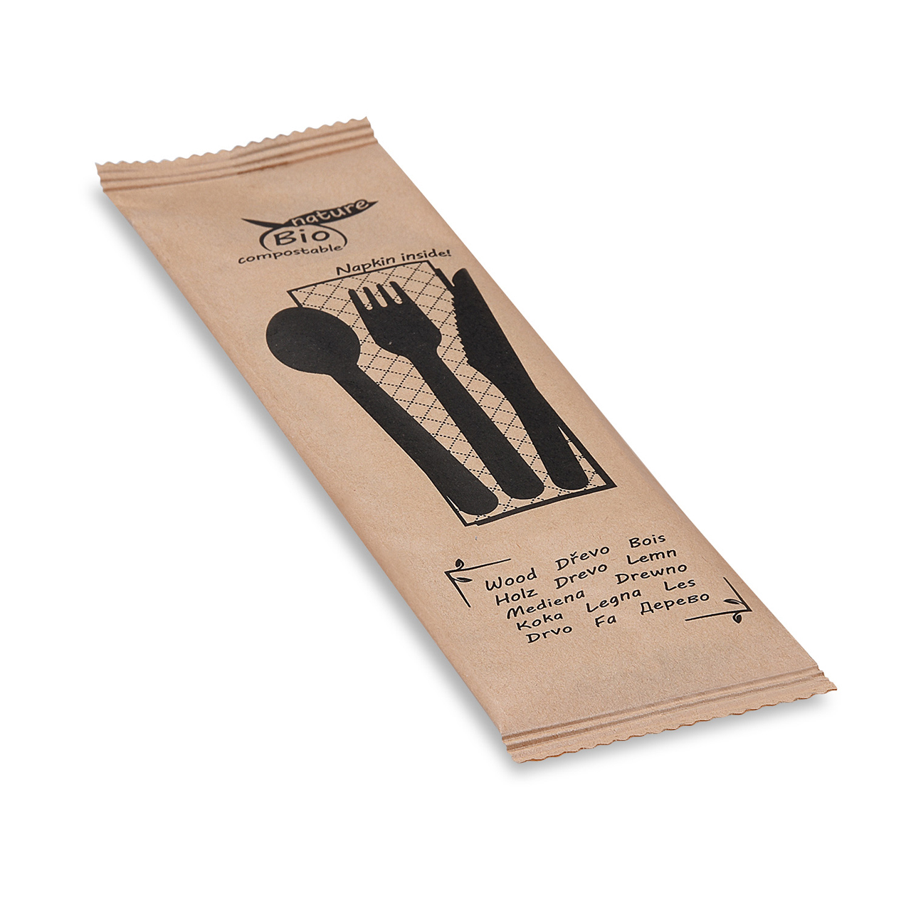 Ein Satz Holzbesteck (Löffel, Messer und Gabel) in einem versiegelten Beutel mit einer Papierserviette. Die Länge des Bestecks beträgt 16,5 cm.