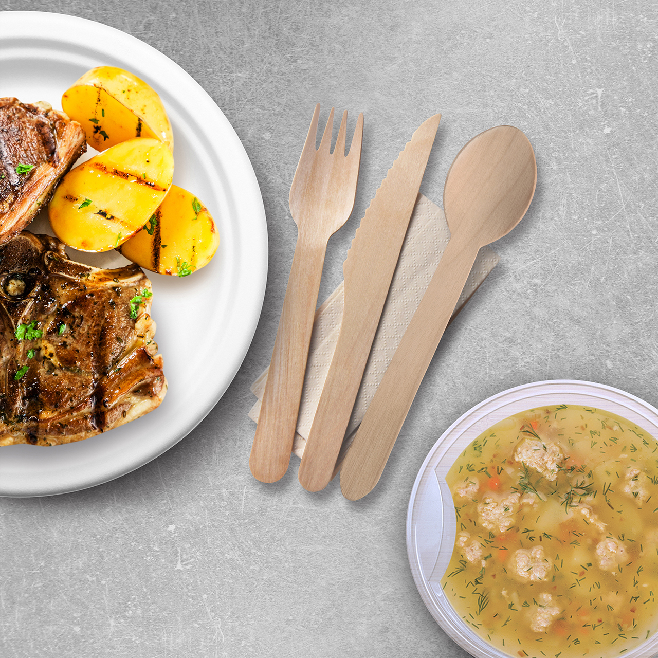 Holzbesteck Set (Messer, Gabel, Löffel, und Serviette) (50 Stck)