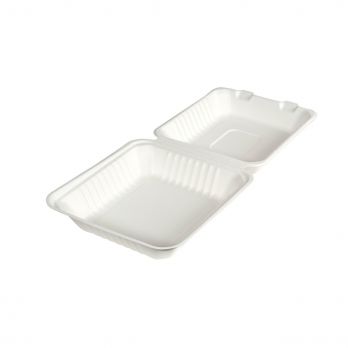 Schüssel mit Deckel / Menübox aus Bagasse mit einem Volumen von 1000 ml. Maße 22,5 cm x 20,1 cm, Höhe 8,5 cm. Kann im Mikrowellenherd bis +100°C verwendet werden.