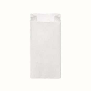 Papiertüte (FSC Mix) mit seitlicher Aufbewahrung weiß. Größe 14+7 cm, Höhe 29 cm. Tragfähigkeit 1,5 kg.
