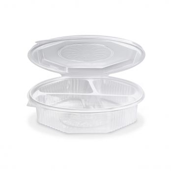 Menüschale (PP) achteckig transparent mit Deckel 2-teilig. Spezifikationen: 21,5 x 22 x 5,7 cm. Volumen 528 + 220 + 180 ml.