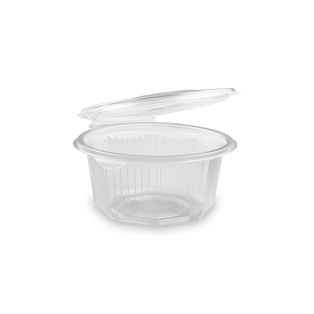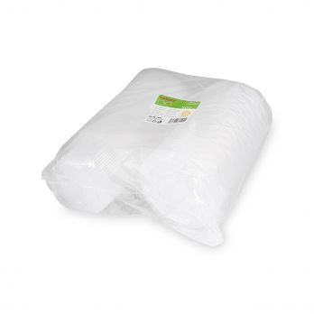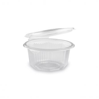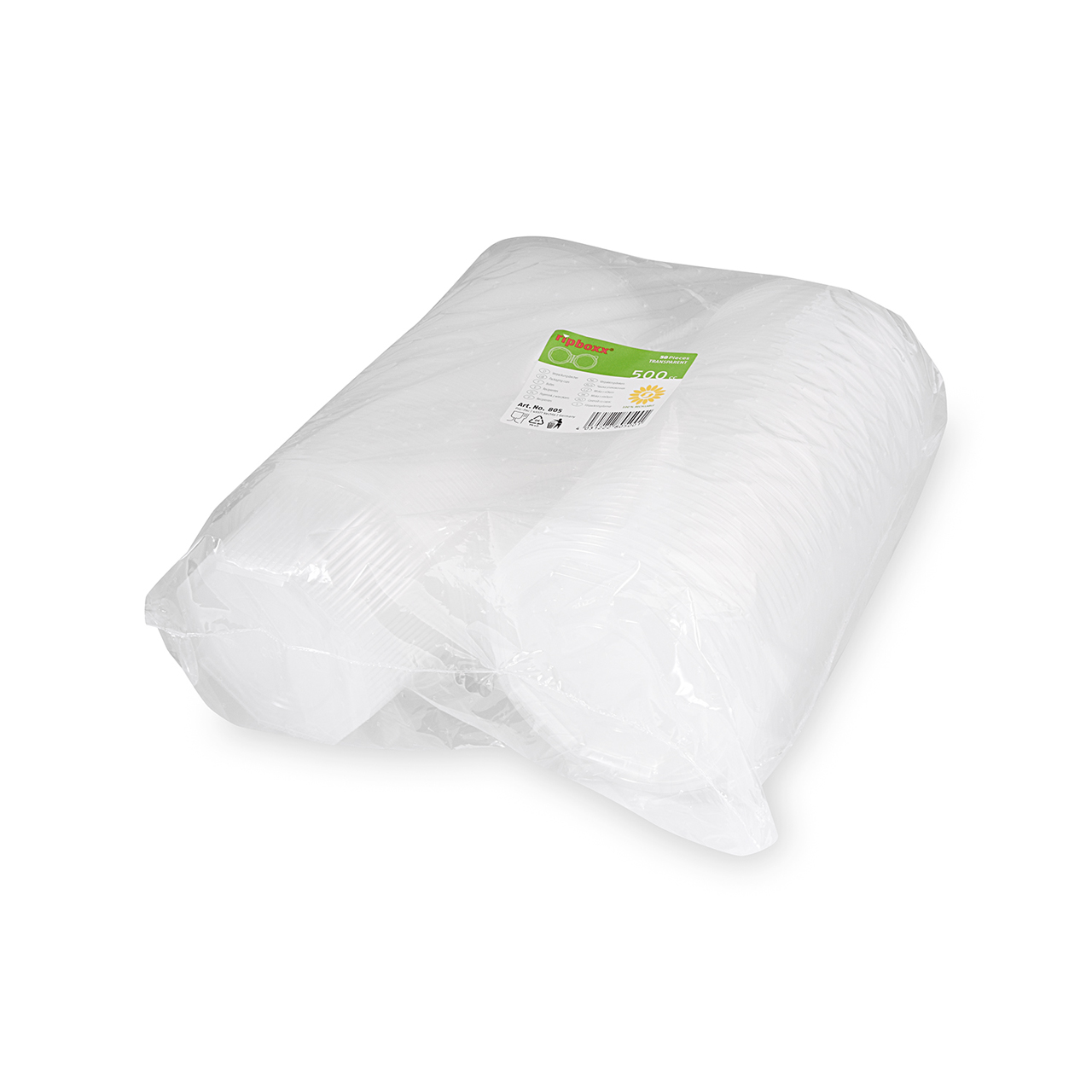 Achteckige Schüssel mit einem Volumen von 500 ml mit Deckel (PP). Größe: 14,5 x 13,8 cm, Höhe 6,8 cm.