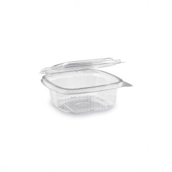 Rechteckige transparente Schüssel mit Deckel 250 ml (PET). Spezifikationen: 11,73 x 11,25 x 4,1 cm.
