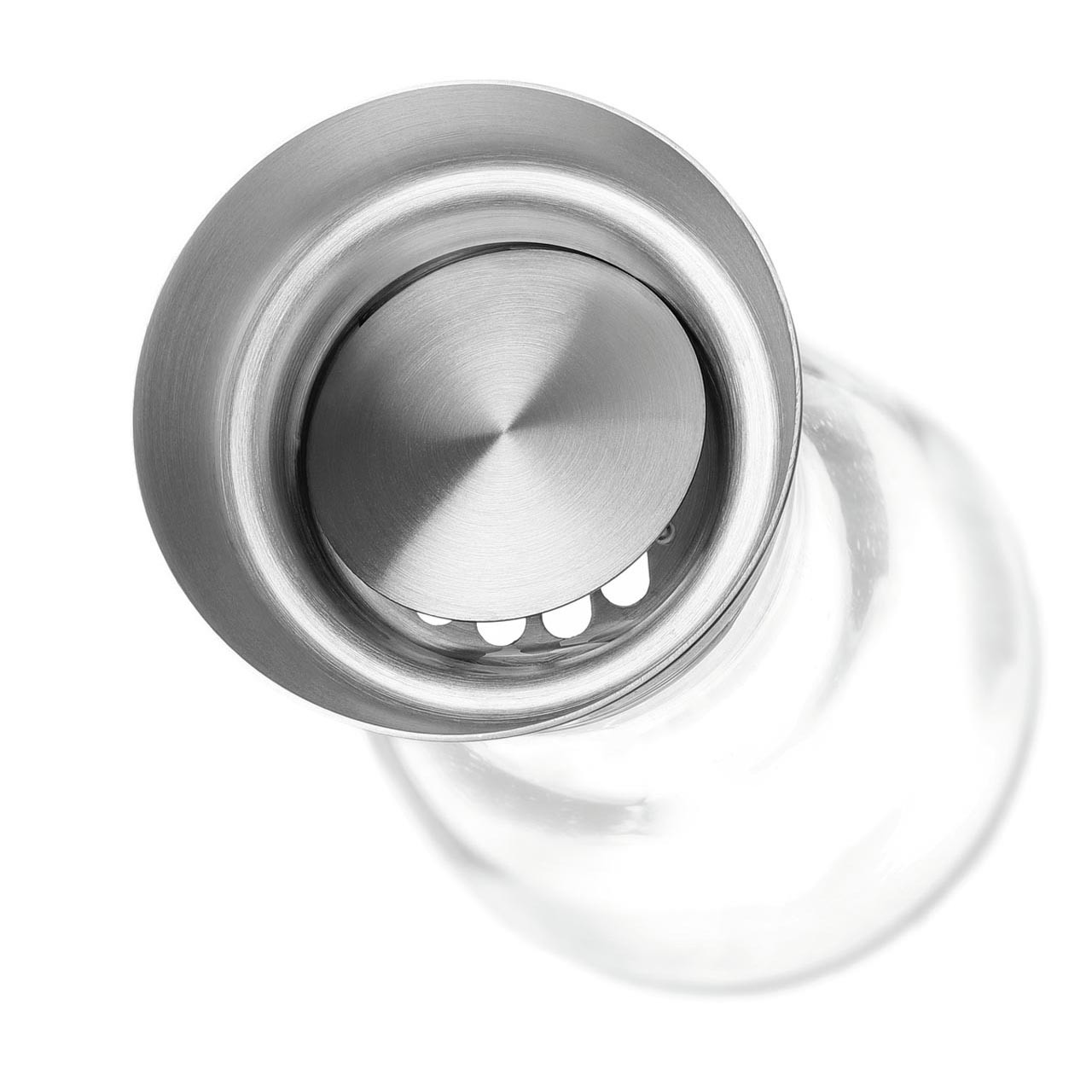 Glaskaraffe mit einem Fassungsvermögen von 0,75 Litern. Abnehmbarer Edelstahldeckel mit Ausgießmechanismus und Dichtungsgummi. Verschlussklappe, integriertes Sieb. Spülmaschinenfest. Maße: B 100 x T 100 x H 295 mm, Gewicht: 0,606 kg.