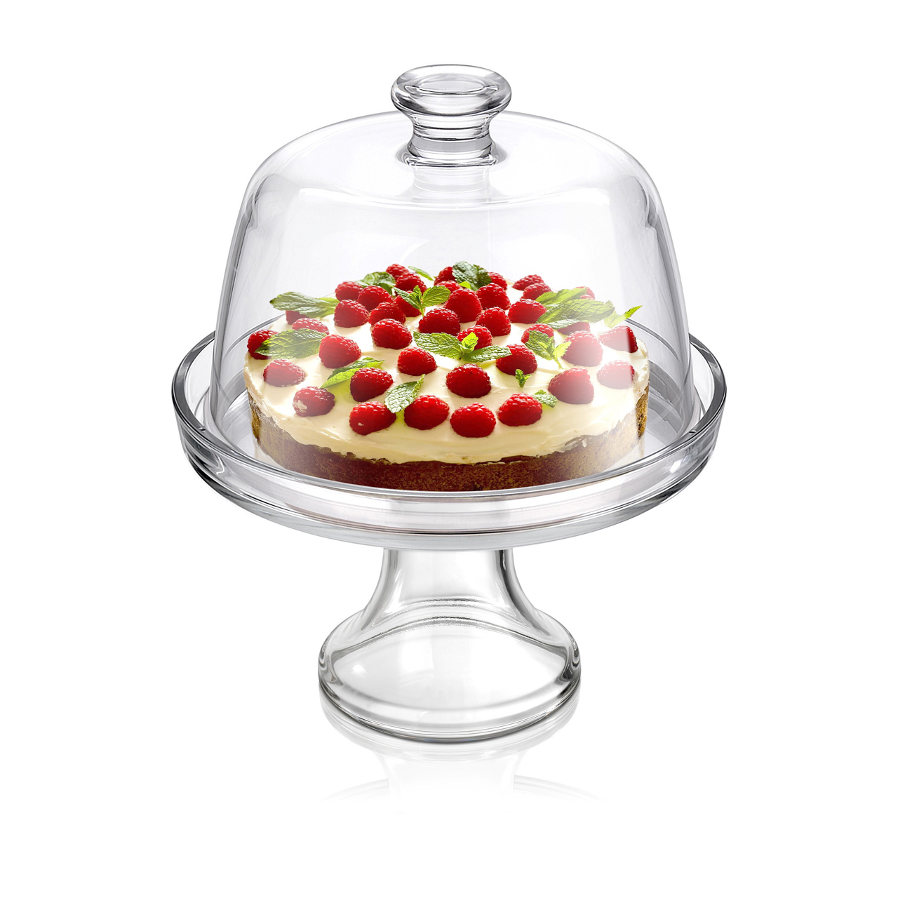 Glastablett auf dem Bein mit Deckel für Kuchen, Desserts und Käse. Deckelhöhe 11 cm, Innendurchmesser 20 cm.