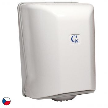 Weiße Wandaufbewahrung für Papierhandtücher in einer Rolle mit den Maßen 20x20 cm, in der Mitte abgerollt. Dies ist praktisch für Betriebe, in denen ein größerer Verbrauch an Papierhandtüchern anfällt, beispielsweise in Küchen und Werkstätten. Es besteht aus schwarzem Kunststoff mit schwarzem Sockel. Nur mit Schrauben montierbar. Abmessungen Tiefe, Breite, Höhe: 210x220x310 mm.