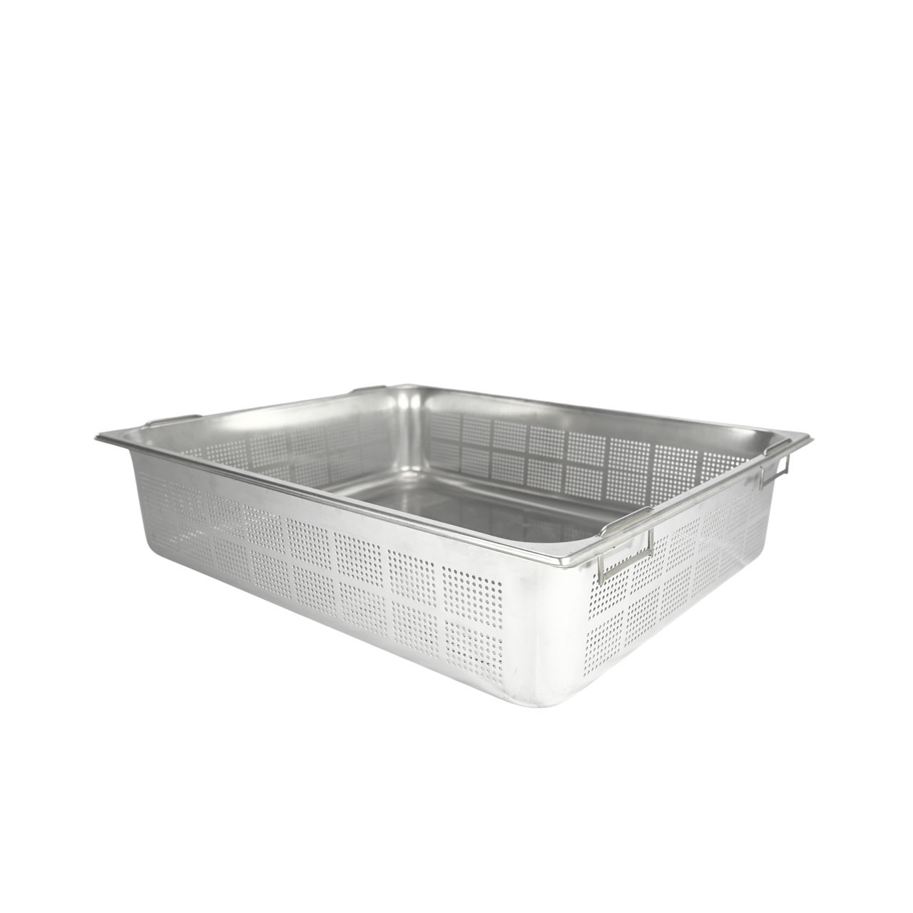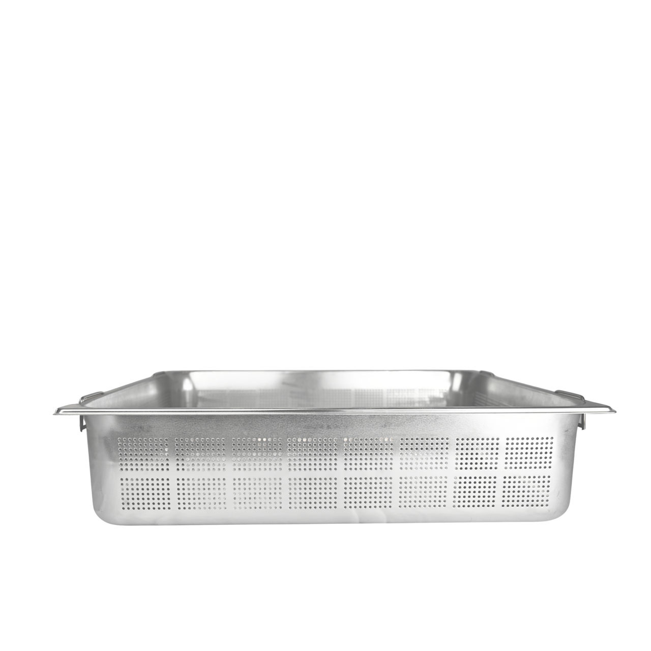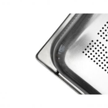 Gastroschüssel GN 2/1 aus Edelstahl, Tiefe 150 mm mit versenkbaren Griffen.