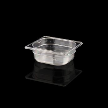 Polycarbonat Gastrobehälter GN 1/6, Tiefe 65 mm. GN sind mit einer Volumenmarkierung (l) ausgestattet. Temperaturbegrenzung von - 30 °C- + 100 °C.