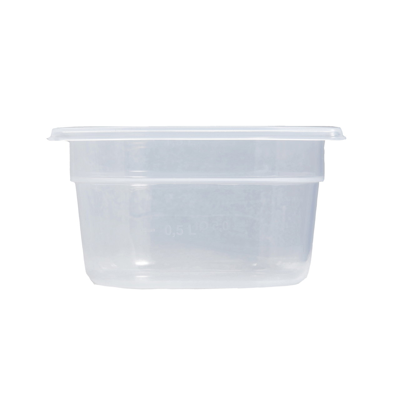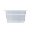 Gastrobehälter aus Polypropylen GN 1/6, Tiefe 100 mm. Sie eignen sich für den normalen Gebrauch, insbesondere für Gefrierschränke. Sie sind temperaturbeständig von - 30 °C bis + 70 °C.