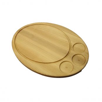 Ovales Steakholzbrett aus Buchenholz. Das Schneidebrett hat 3 Löcher für Schalen mit einem Durchmesser von 6-7 cm für Gewürze. Die A bmessungen des Schneidebretts sind 45x32x1,9cm. Geölte Oberfläche.
