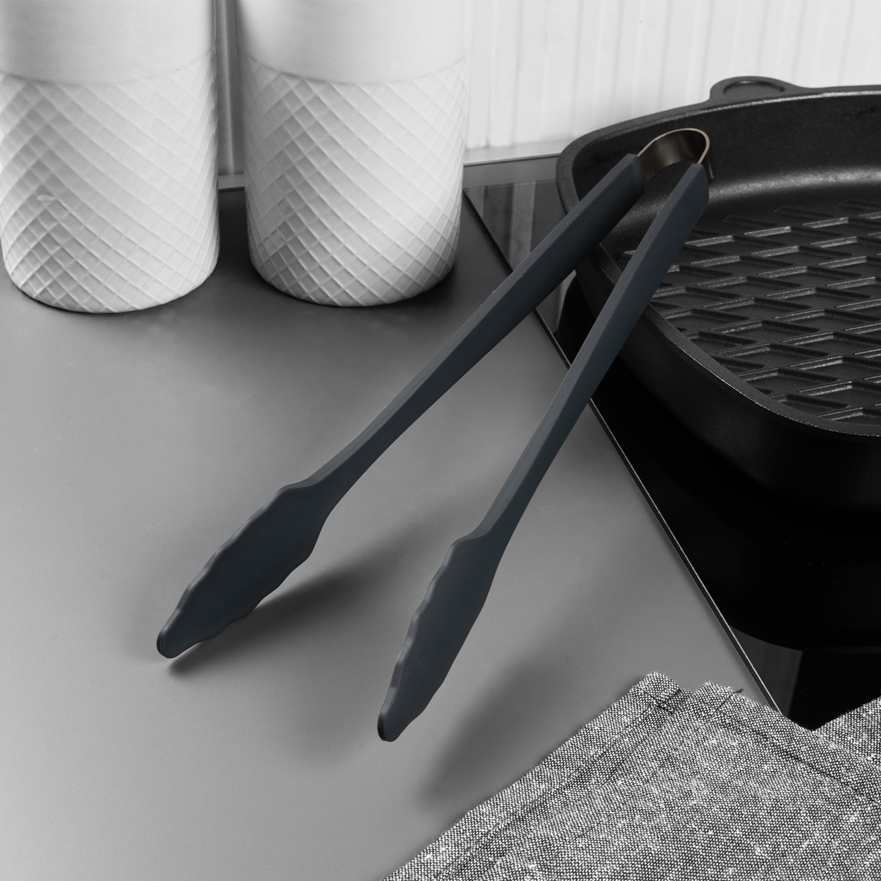 Langlebige metallverstärkte Zange mit Silikonoberfläche. Die Silikonoberfläche verhindert eine Beschädigung der Antihaftbeschichtung.