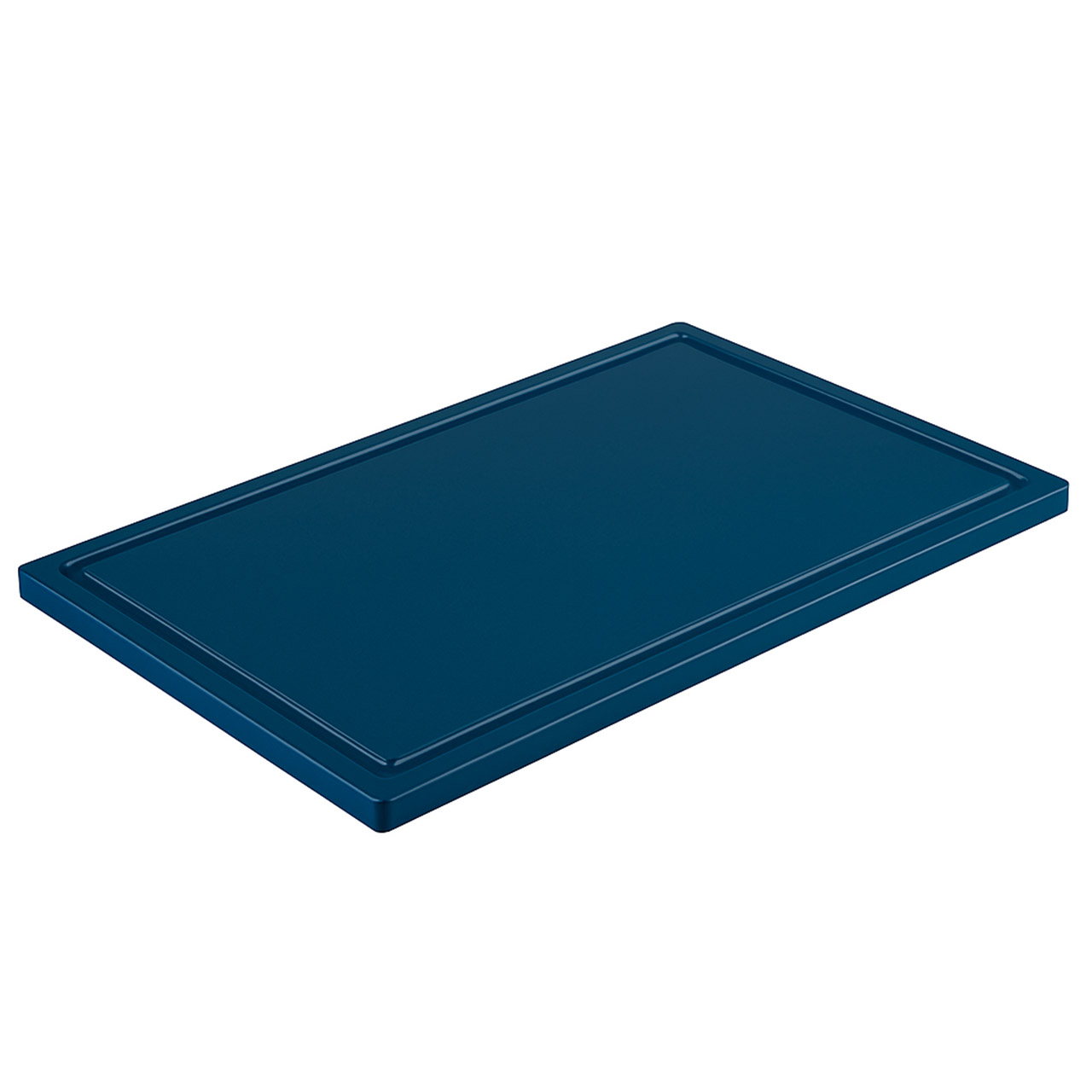 Schneidebrett / Brett aus Kunststoff mit den Maßen 53 x 32,5 cm, Höhe 2 cm. Rutschfeste Füße und Rille am Rand. Farbe: blau.