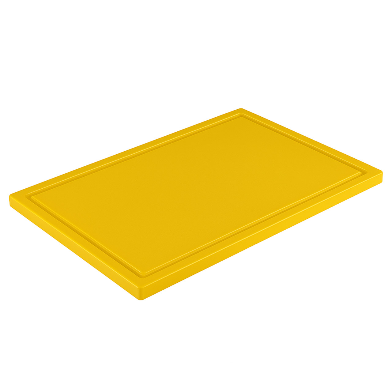 Schneidebrett / Brett aus Kunststoff mit den Maßen 53 x 32,5 cm, Höhe 2 cm. Rutschfeste Füße und Rille am Rand. Farbe: gelb.