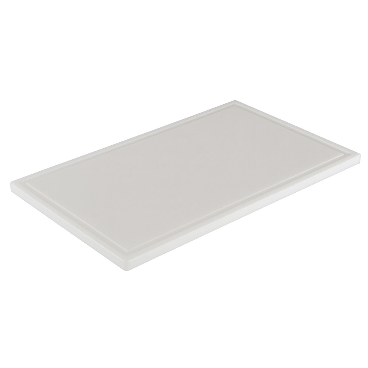 Schneidebrett / Brett aus Kunststoff mit den Maßen 53 x 32,5 cm, Höhe 2 cm. Rutschfeste Füße und Rille am Rand. Farbe: weiß.