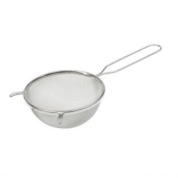 Metallgewebe, fest mit Stahlblechrand und Griff mit Stahldrahthaken verbunden. Galvanisch beschichtet. Dickes, dünnes Gewebe mit 1x 1 mm Maschenweite.