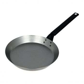 Klassische Stahlpfanne. Die Pfanne muss vor dem Gebrauch trocken gebrannt werden. Nach dem Gebrauch muss die Oberfläche getrocknet u nd neu eingefettet werden, Materialstärke 1 mm.