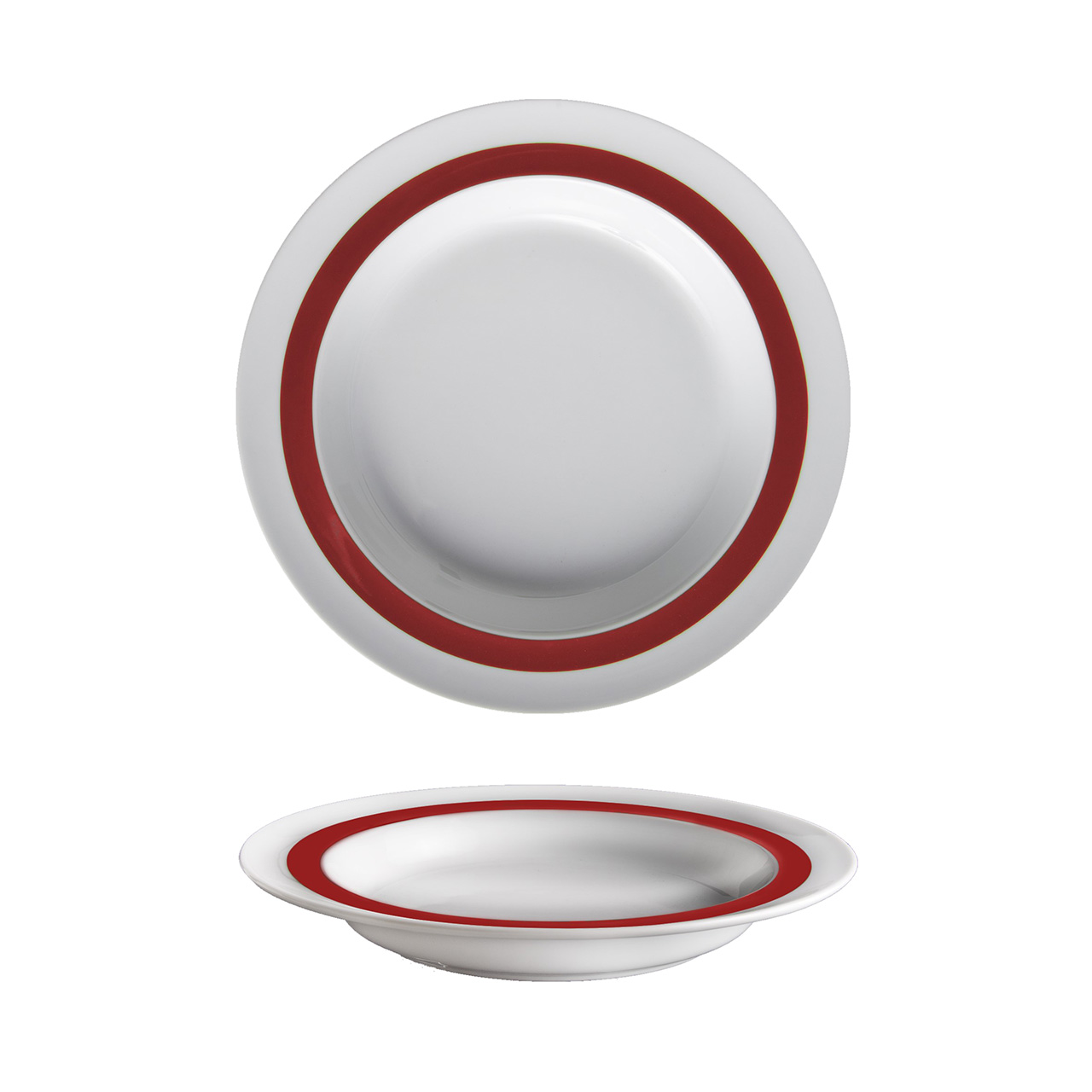 Halbtiefer Teller mit 26 cm Durchmesser und rotem Dekor. Dank besonderer Details wie kontrastierenden Farben und Griffmulden zum leichteren Aufnehmen von Bissen ist das ACTIVE-Porzellan speziell für Menschen mit motorischen Einschränkungen und Senioren entwickelt worden.
