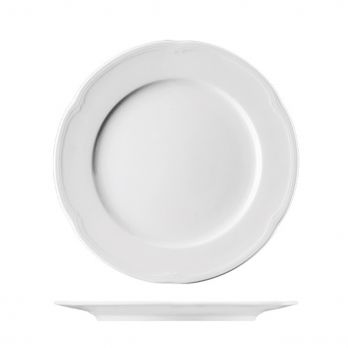 Flacher Teller mit 28 cm Durchmesser. Das sanft gewölbte ARCADIA-Porzellan passt ideal zu historisch eingerichteten Interieurs und Restaurants im Retro-Stil.