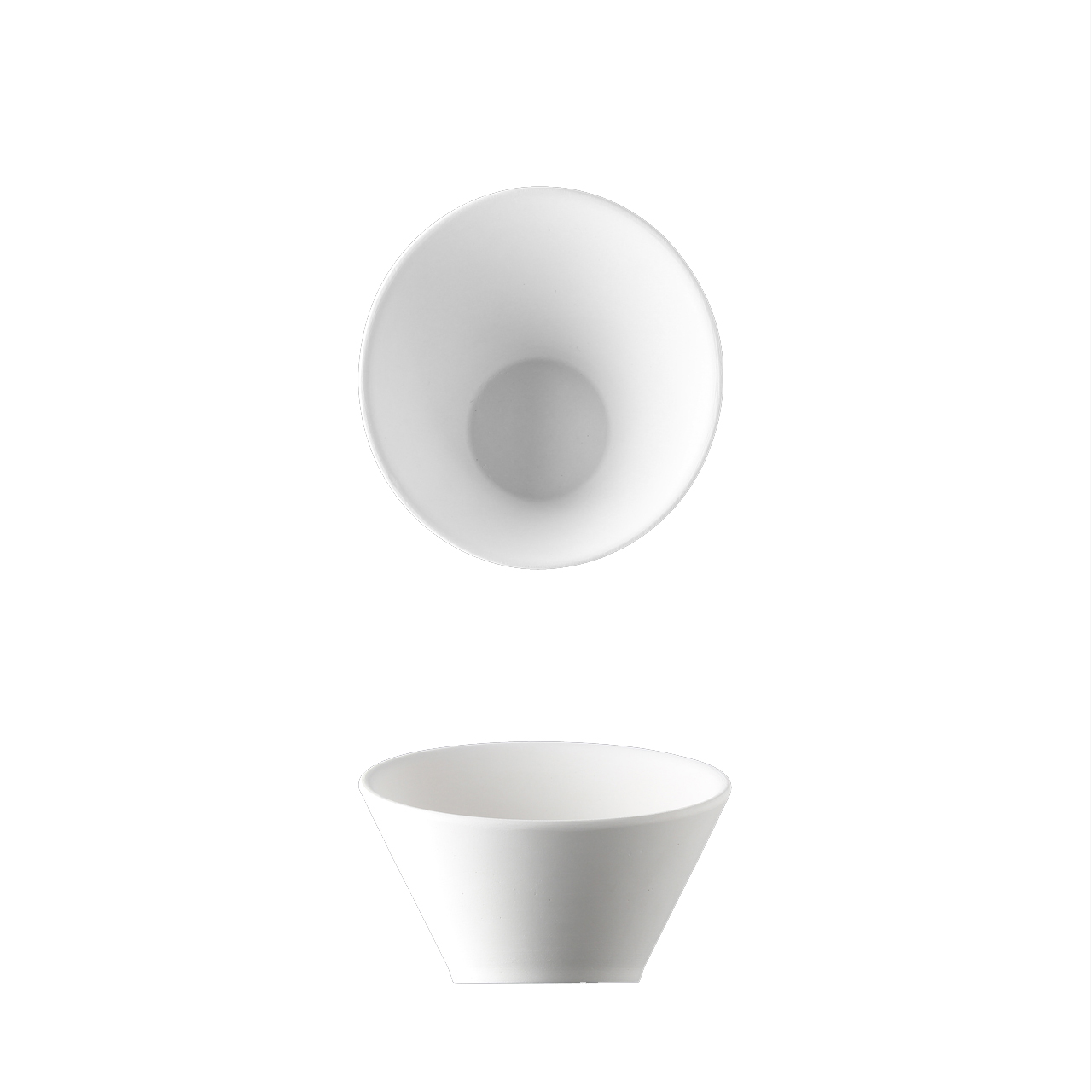 Eine abgeschrägte Schale mit einem Durchmesser von 14 cm, geeignet zum Servieren von Beilagen.
